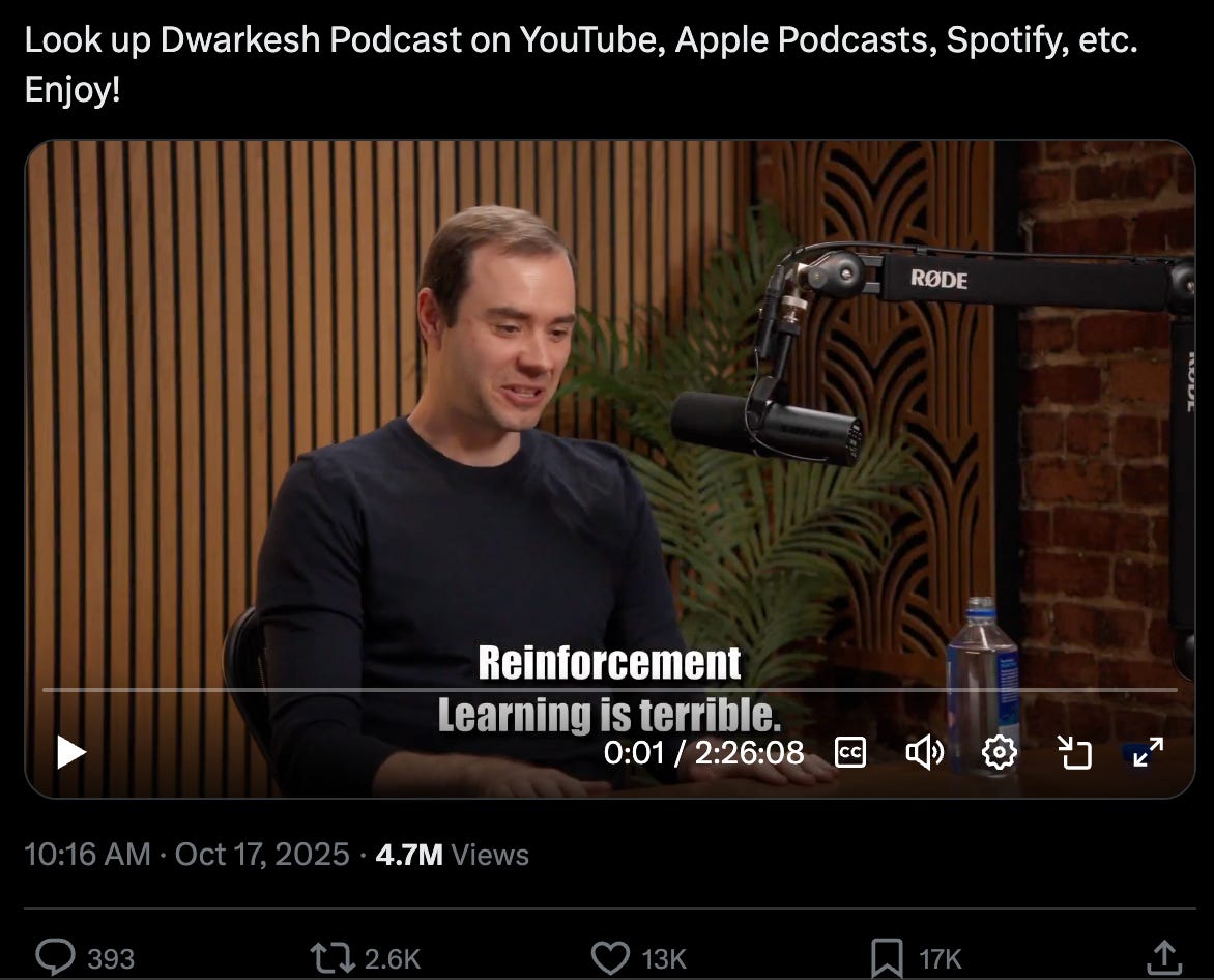 Before we go further, the most important podcast of 2025 for understanding the progress of LLMs is this podcast between Dwarkesh and Andrej Karpathy. Please give it a listen if you haven’t yet.