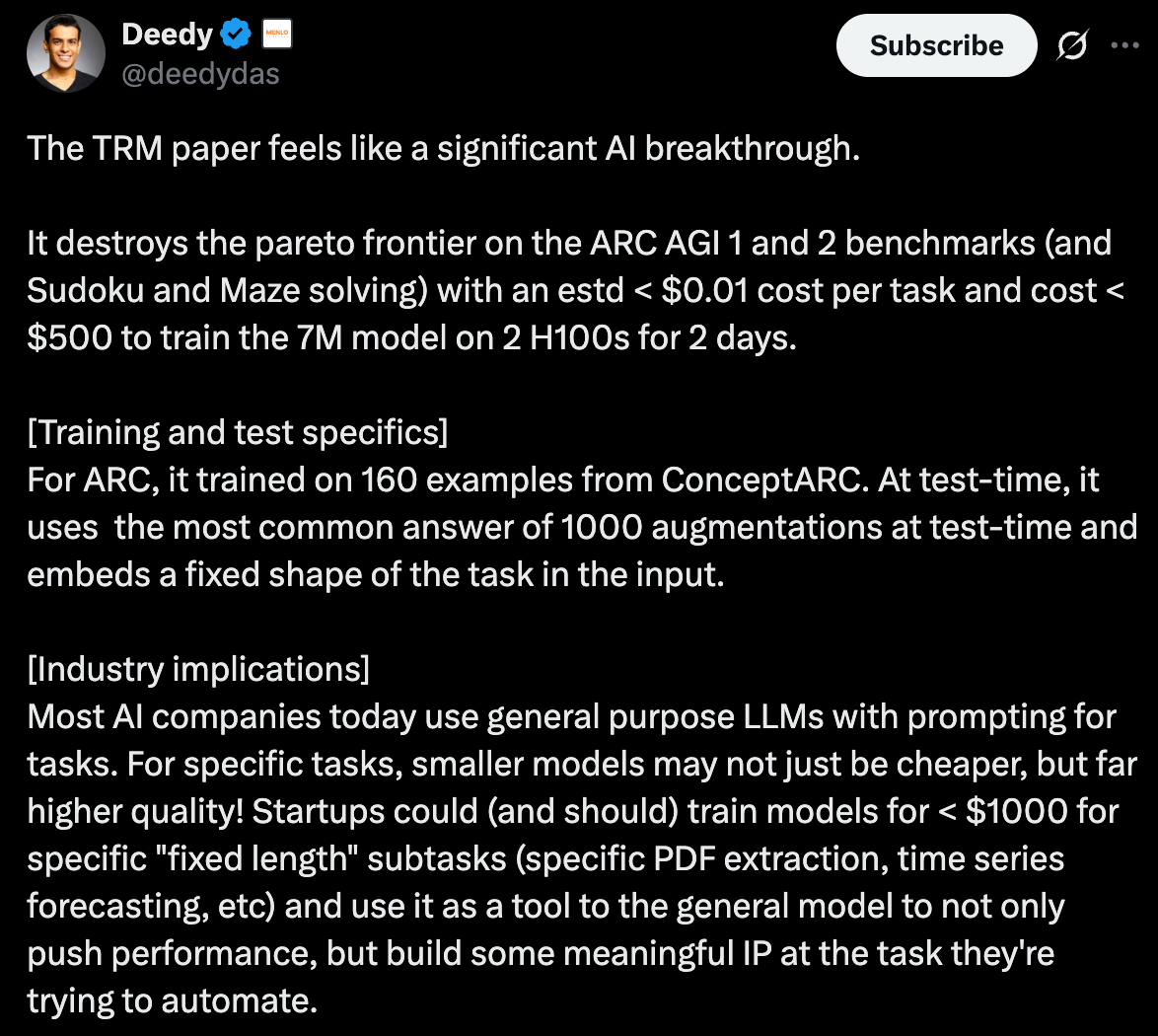 Put simply, a 7M parameter model (think <0.01% of the parameters in the large models we generally use and think of) outperformed multi-billion/trillion parameter models in performing specific complex tasks like solving a Sudoku puzzle. It essentially uses repetition and an internal record of the chain of thought (reasoning) of the model to arrive at the best answer. Given it can see it’s own reasoning, it can continue to improve rapidly on its answer at lower training costs and inference costs given the size of the model. The paper’s conclusions match a lot of what Karpathy laid out without the tool calling or expert consultation piece.