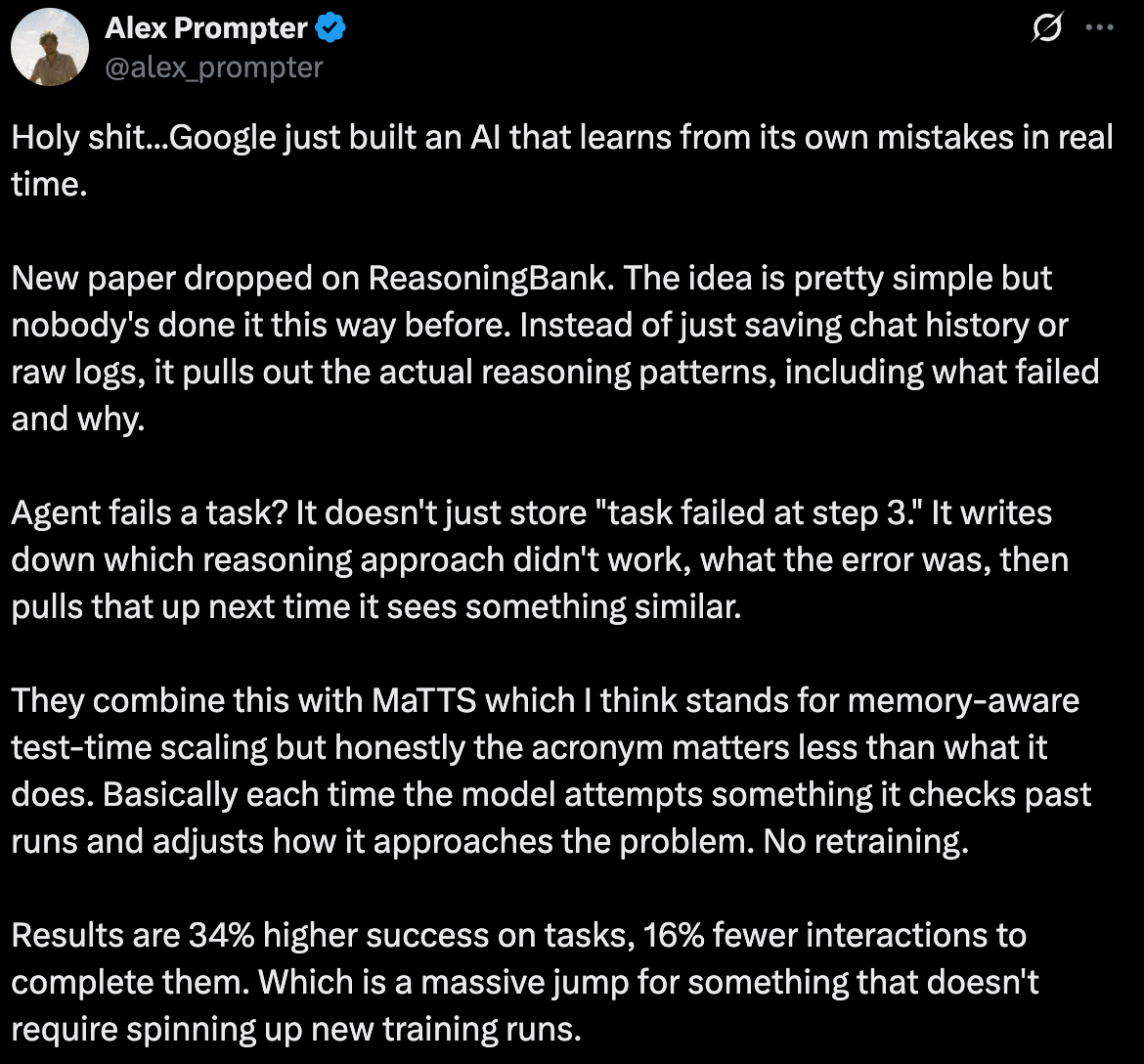 recently highlighted an interesting post in his newsletter on a Google research paper called ReasoningBank.Reasoning Bank: Scaling Agent Self-Evolving with Reasoning Memory